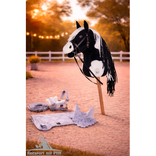 Hobby Horse Steckenpferd +Trense Zügel + Halfter Set + Fliegenhaube + Decke und Pferdepass schwarz/weiss