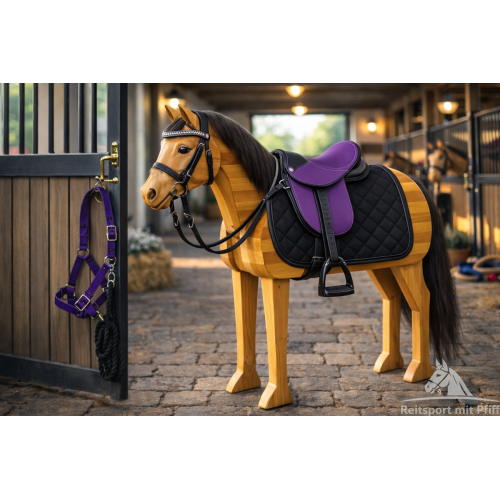 KLEINE Holzpferde Sattel + Glitzer Trensen Halfter Set bis 145 cm Umfang lila